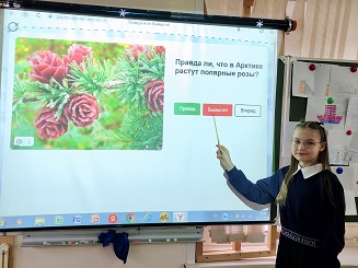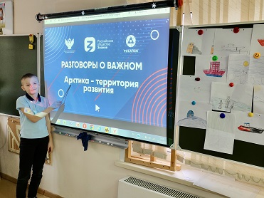 У четвероклассников занятие началось с викторины, затем ребята с большим интересом прослушали интервью с капитаном атомного ледокола «50 лет Победы» Сасовым Русланом Владимировичем, который рассказал об атомных ледоколах.
