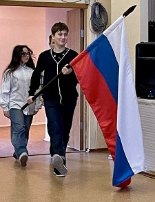 Почётное право установить флаг Российской Федерации было доверено ученикам 6 «Ц» класса – Михаилу, Полине и Сергею.