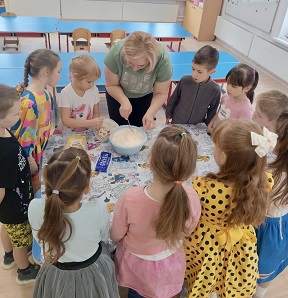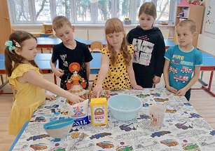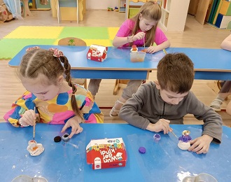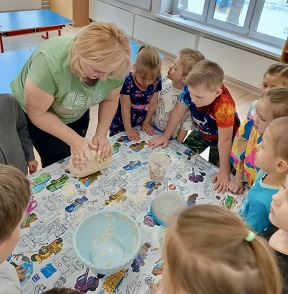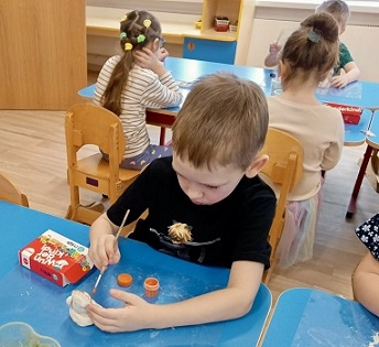 Дети из соленого теста лепили «Дымковских барышень», а потом расписали их гуашью. В ходе занятия ребята познакомились со свойствами муки и соли, используя простейшие приемы экспериментальной деятельности, узнали процесс приготовления теста для лепки.
